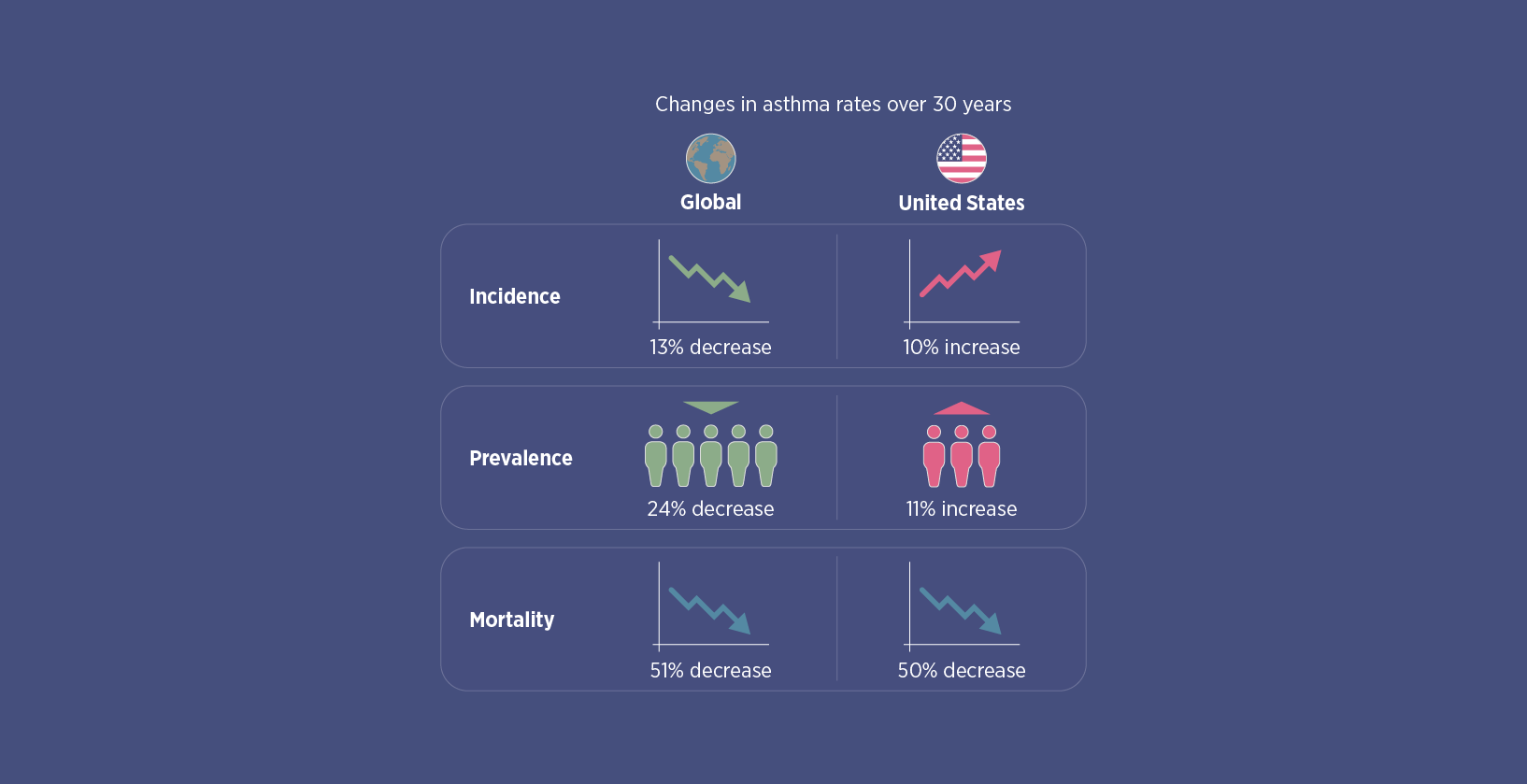 The Global Burden of Disease Study reveals differences in global and US trends for asthma prevalence and incidence over the last 3 decades.